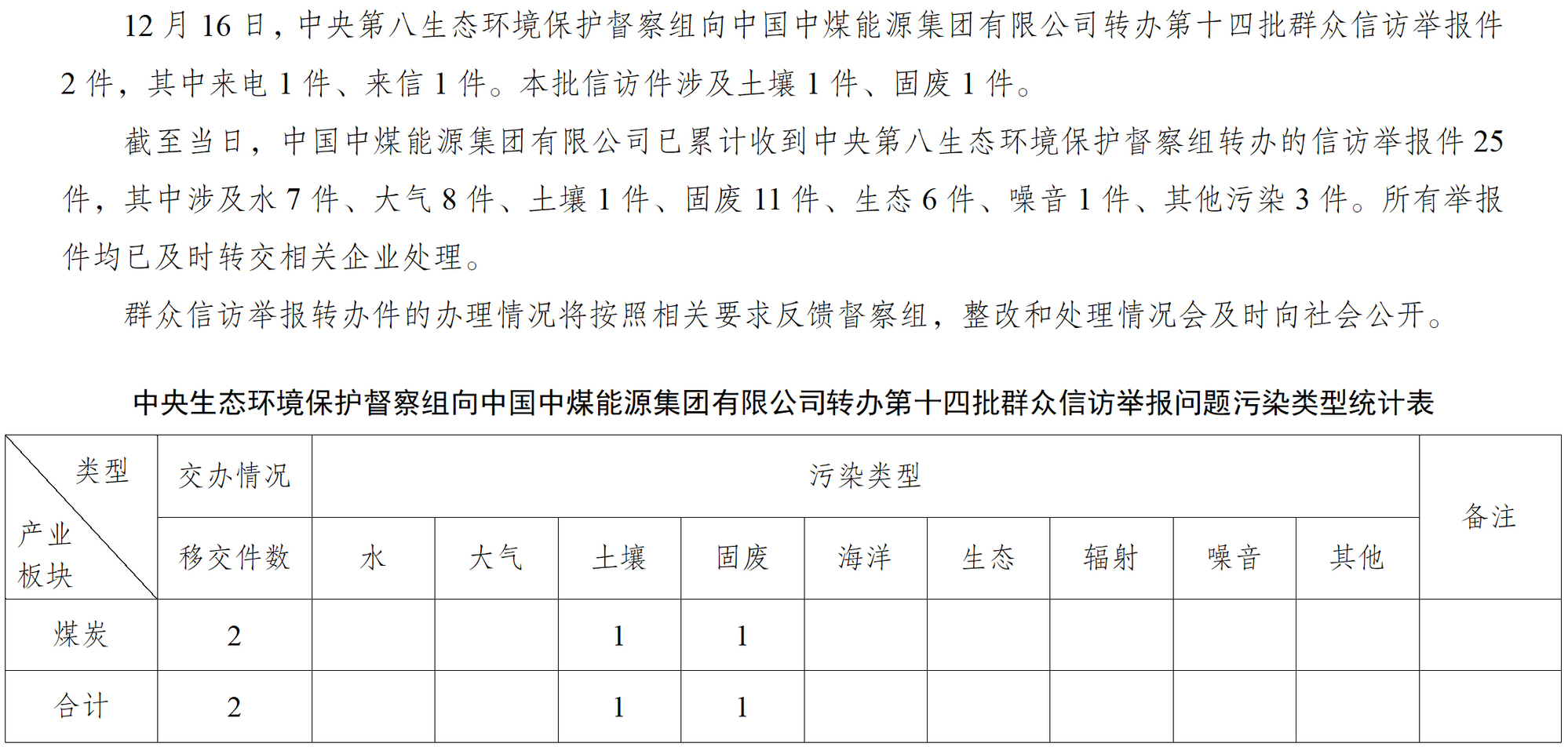 中央第八生態環境保護督察組向中國中煤能源集團有限公司轉辦第十四批群眾信訪舉報件