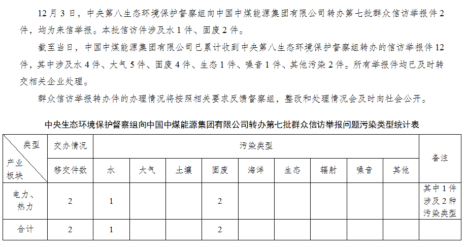 中央第八生態環境保護督察組向中國中煤能源集團有限公司轉辦第七批群眾信訪舉報件